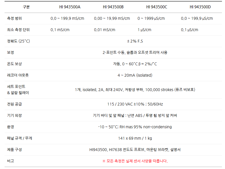 모델별로 다양한 전도도 측정 범위를 지원하여 용도에 맞게 선택할 수 있습니다.