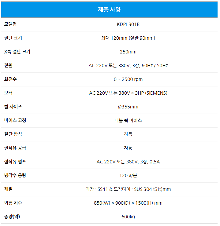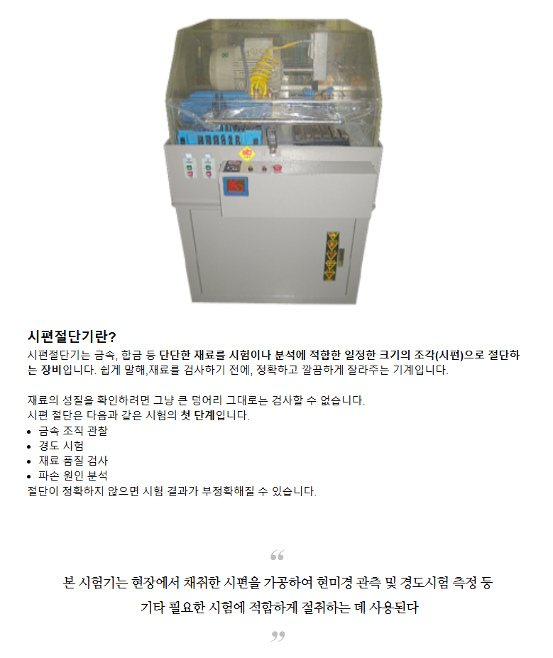 품명 자동 대형 시편절단기 KDPI-301B는 금속 재료 시험을 위한 연마 절단 장비로, 자동 절단과 절삭유 공급 기능을 통해 안정적이고 효율적인 시편 가공을 지원합니다.
