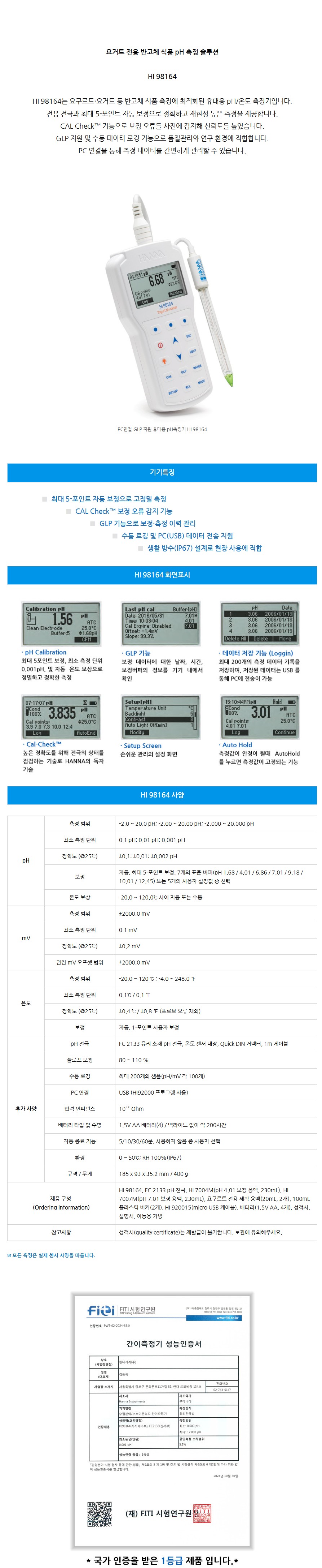 요거트 전용 반고체 식품 pH 측정 솔루션 HI 98164