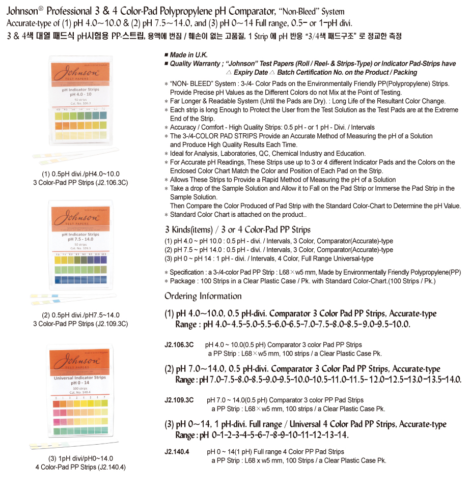 Johnson® Professional 3 & 4 Color-Pad Polypropylene pH Comparator, “Non-Bleed” SystemAccurate-type of (1) pH 4.0~10.0 & (2) pH 7.5~14.0, and (3) pH 0~14 Full range, 0.5- or 1-pH divi.