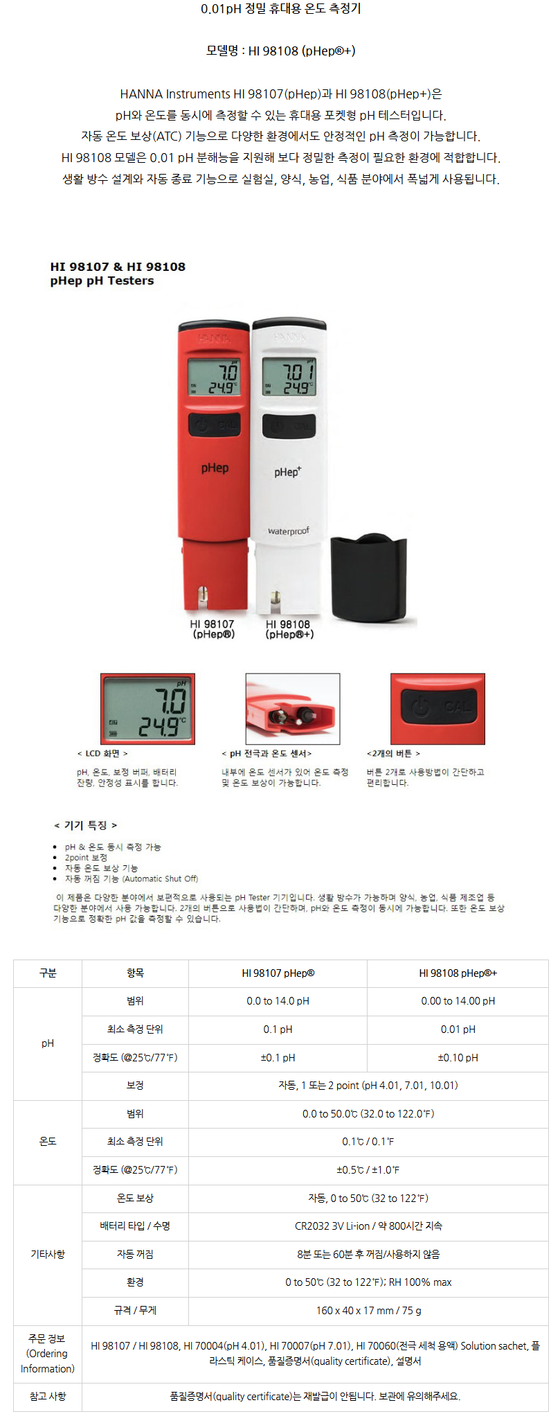 품명 휴대용 pH 테스터 pHep 시리즈 HI98107·HI98108. 자동온도보상과 1~2포인트 보정, 방수 설계로 현장 pH 측정에 적합.