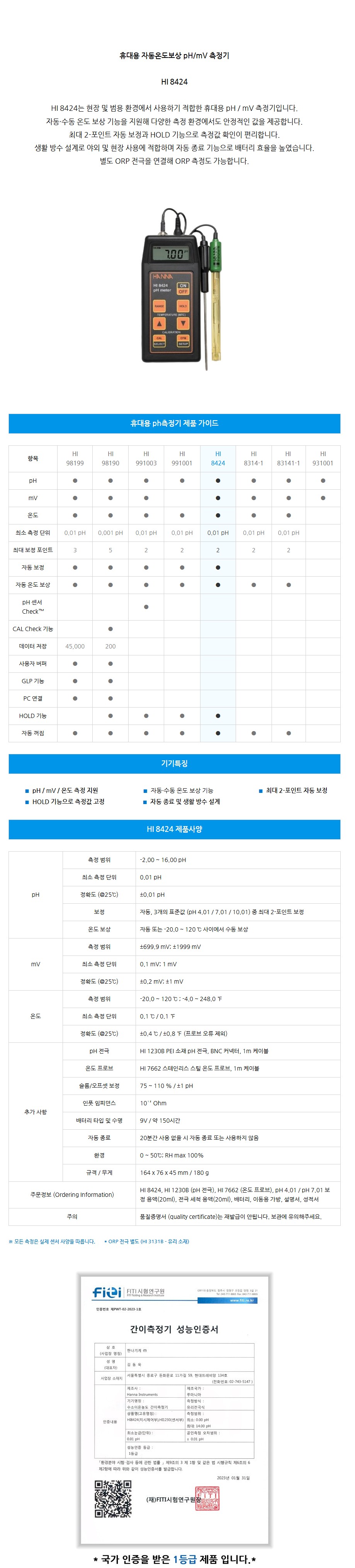 품명 휴대용 자동온도보상 pH/mV 측정기 HI 8424