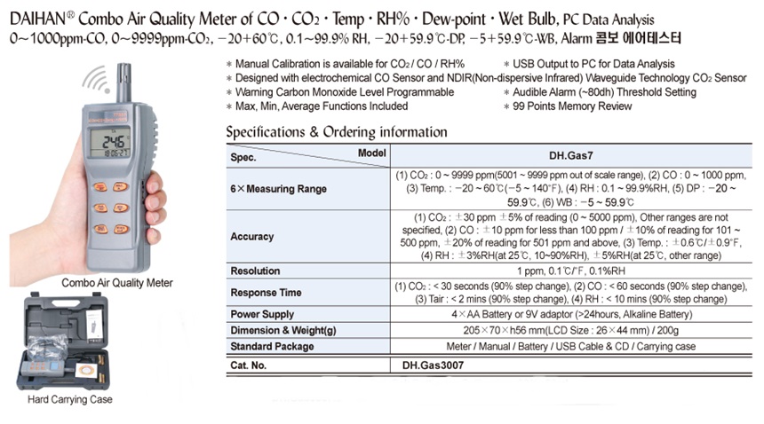 DAIHAN® Combo Air Quality Meter of CO·CO 2 ·Temp·RH%·Dew-point·Wet Bulb, PC Data Analysis0~1000ppm-CO, 0~9999ppm- CO 2 , -20+60℃, 0.1~99.9% RH, -20+59.9℃-DP, -5+59.9℃-WB, Alarm 콤보 에어테스터