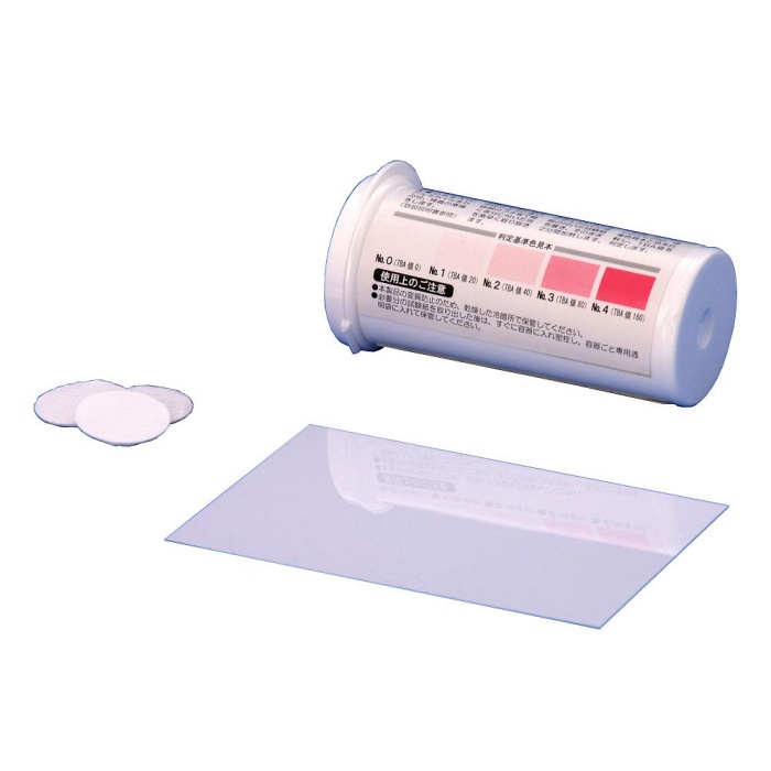 • TBA (Thiobarbituric Acid)는 유지의 과산화 생성물과 반응하여 적색 염료를 생성합니다. 본 시험지의 TBA값은 대두유 등의 식용 식물유의 과산화지질, 또는 유지 가공 식품 중의 과산화지질이 분해에 의해 생기는 2차 생성물의 양적 기준이 됩니다. 판정 기준의 기준 물질은 TEP(테트라에톡시프로판)입니다.