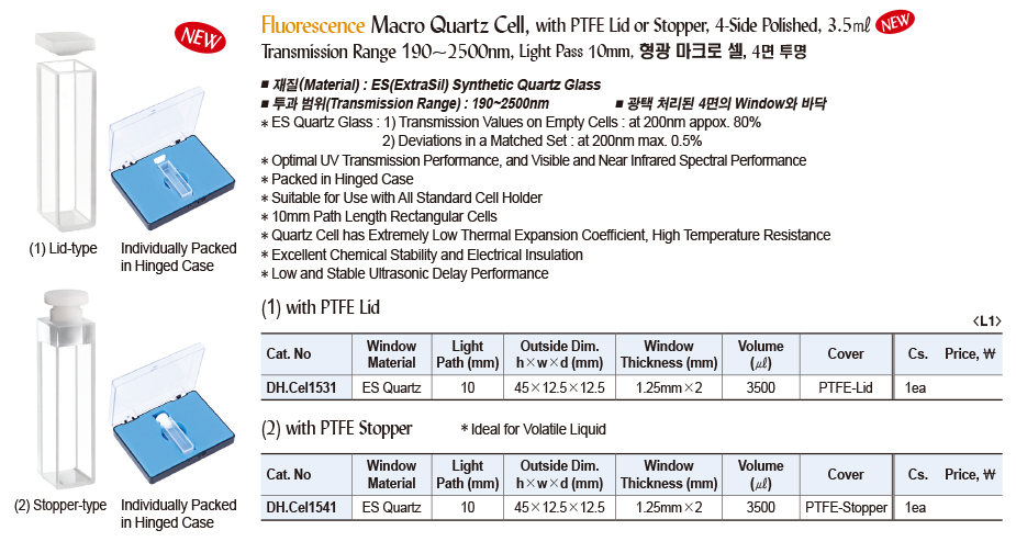 4-Side Polished, 3.5㎖ Transmission Range 190 ~ 2500nm, Light Pass 10mm