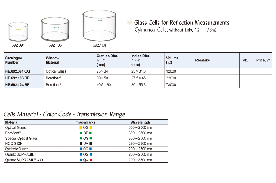 Glass Cells for Reflection MeasurementsCylindrical Cells, without Lids, 12 ~ 73㎖