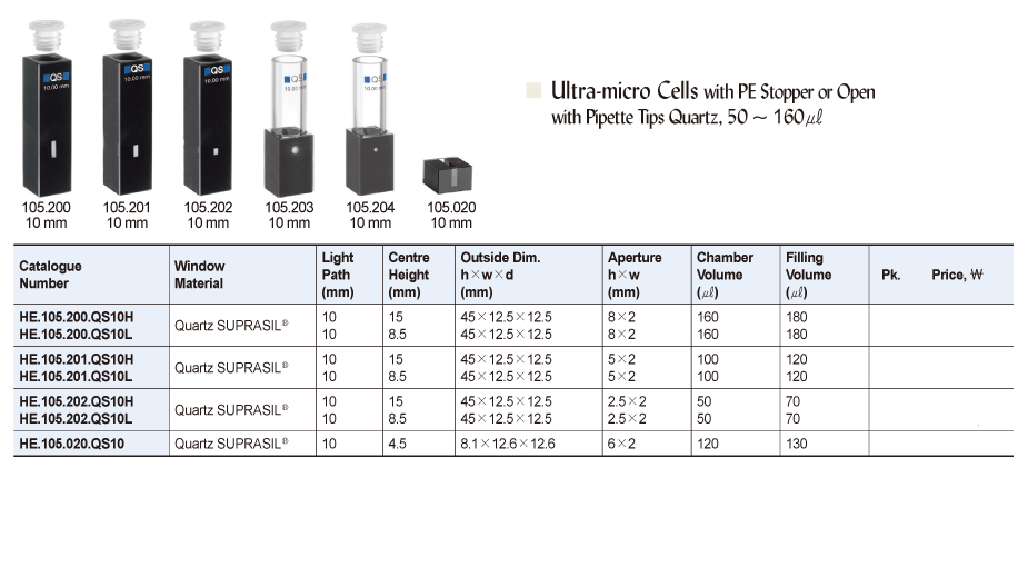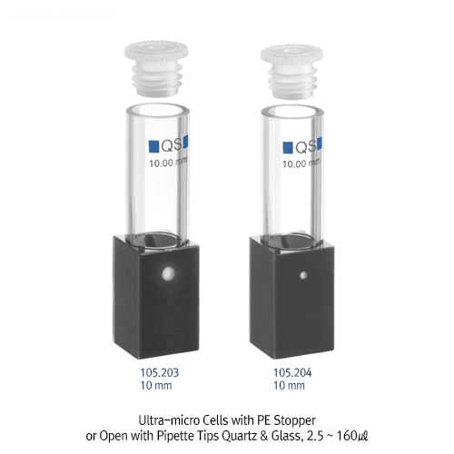 Ultra-micro Cells with PE Stopper or Openwith Pipette Tips Quartz, 50 ~ 160㎕