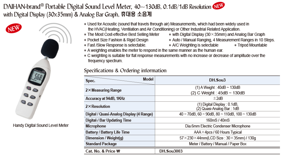 DAIHAN-brand® Portable Digital Sound Level Meter, 40~130dB, 0.1dB/1dB Resolution with Digital Display (30x35mm) & Analog Bar Graph