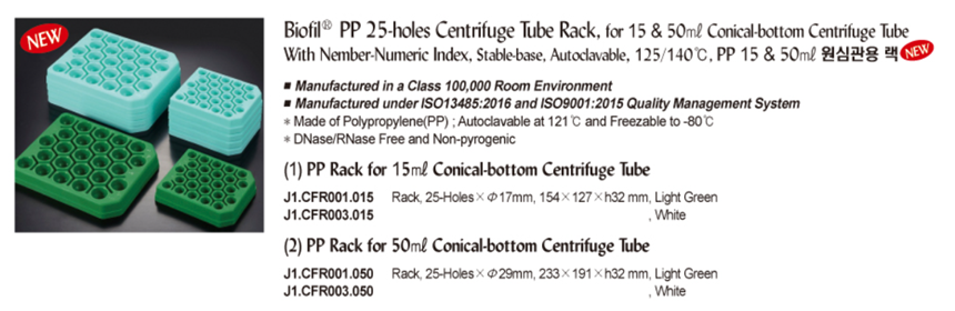 Biofil® PP 25-holes Centrifuge Tube Rack, for 15 & 50㎖ Conical-bottom Centrifuge TubeWith Nember-Numeric Index, Stable-base, Autoclavable, 125/140℃, PP 15 & 50㎖ 원심관용 랙