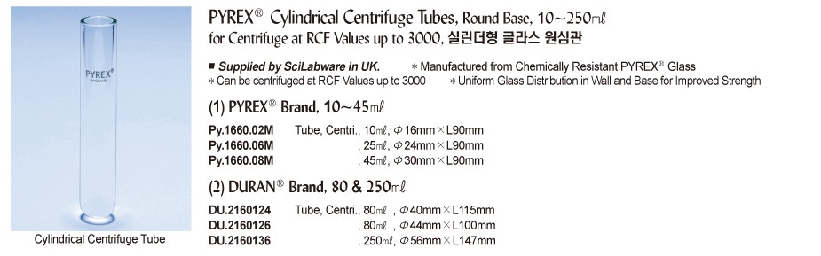 PYREX® Cylindrical Centrifuge Tubes, Round Base, 10~250㎖ for Centrifuge at RCF Values up to 3000