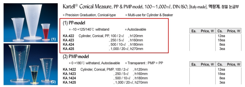 Kartell® Conical Measure, PP & PMP-model, 100~1,000㎖, DIN/ISO, [ Italy-made ] , 액량계, 정밀 눈금부