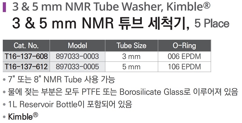 품명 ■ 7인치 또는 8인치 NMR Tube 사용 가능 ■ 물에 젖는 부분은 모두 PTFE 또는 Borosilicate Glass로 이루어져 있음 ■ 1L Reservoir Bottle이 포함되어 있음 ■ Kimble®