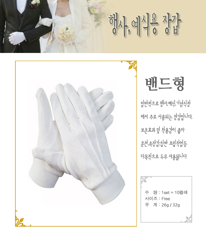 품명 ■ 일반적으로 행사, 예식, 기념식장에서 주로 사용되는 장갑 ■ 보온효과 및 착용감이 좋아 운전, 속장갑, 일반 조립작업 등 다목적을 사용됨