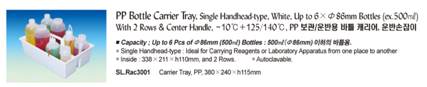PP Bottle Carrier Tray, Single Handhead-type, White, Up to 6×Φ86mm Bottles (ex.500㎖)With 2 Rows & Center Handle, -10℃+125/140℃, PP 보관/운반용 바틀 캐리어, 운반손잡이
