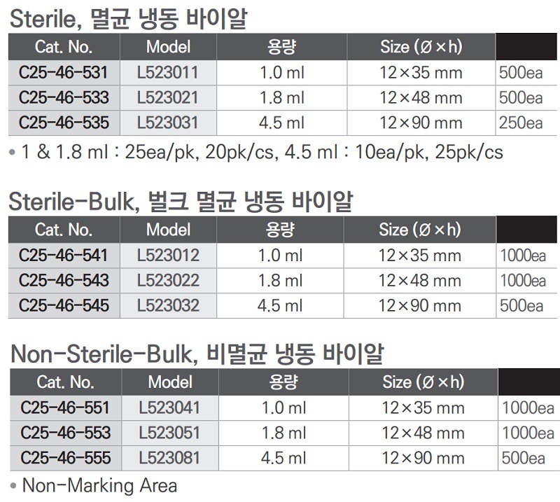Sterile-Bulk, 벌크 멸균 냉동 바이알| Cat. No. | Model | 용량 | Size (Φ×h) |
