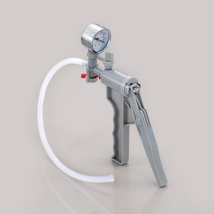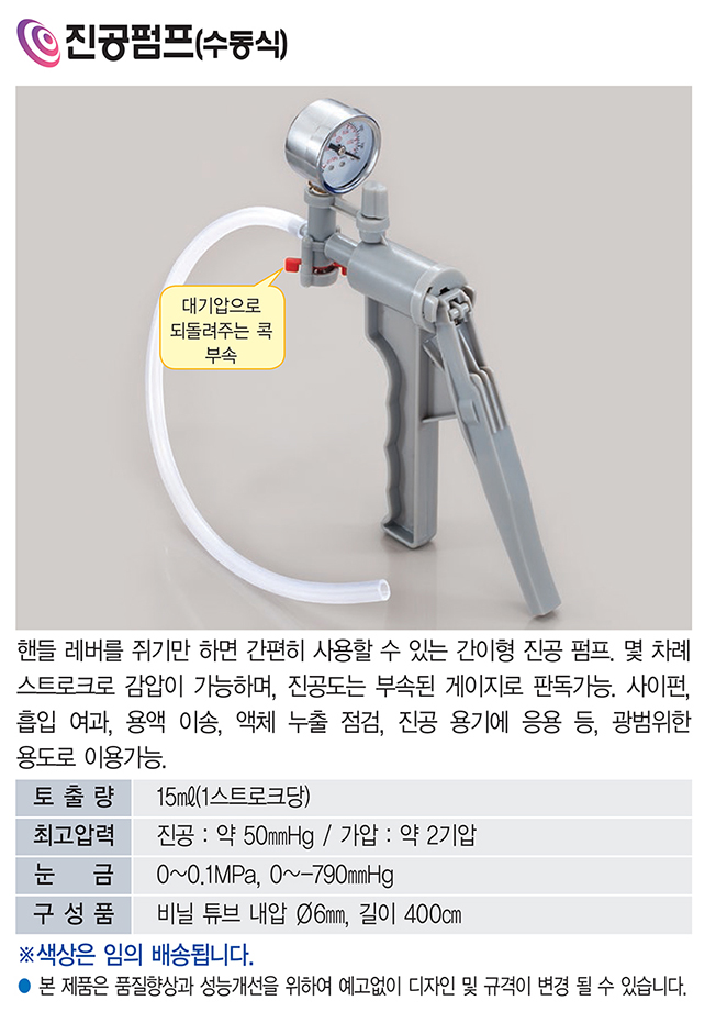 개요 : 핸들 레버를 쥐기만 하면 간편히 사용할 수 있는 간이형 진공 펌프, 몇 차례 스트로크로 감압이 가능하며, 진공도는 부속된 게이지로 판독가능. 사이펀, 흡입여과, 용액 이송, 액체 누출 점검, 진공 용기에 응용 등, 광범위한 용도로 이용 가능.