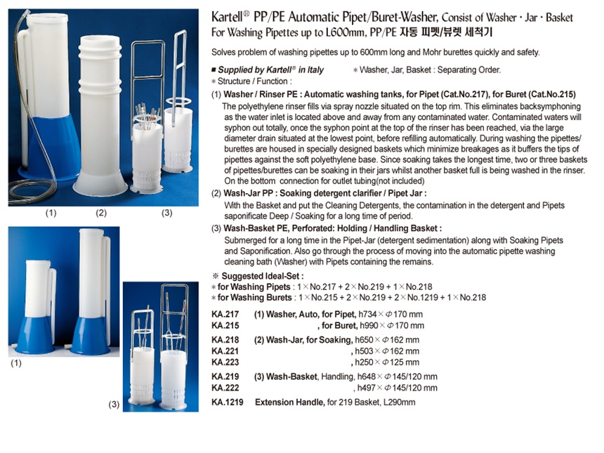 Kartell® PP/PE Automatic Pipet/Buret-Washer, Consist of Washer·Jar·BasketFor Washing Pipettes up to L600mm, PP/PE 자동 피펫/뷰렛 세척기