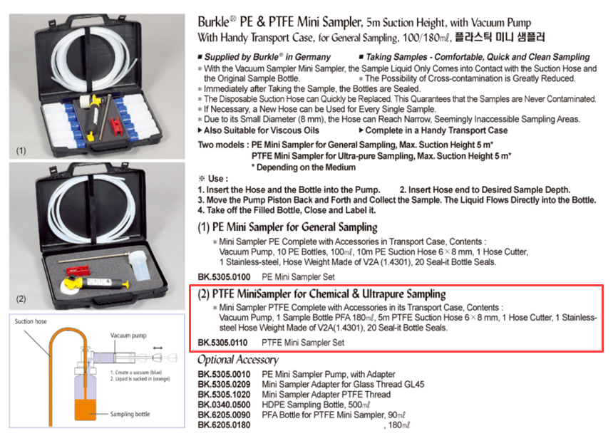 Burkle® PE & PTFE Mini Sampler, 5m Suction Height, with Vacuum PumpWith Handy Transport Case, for General Sampling, 100/180㎖, 플라스틱 미니 샘플러