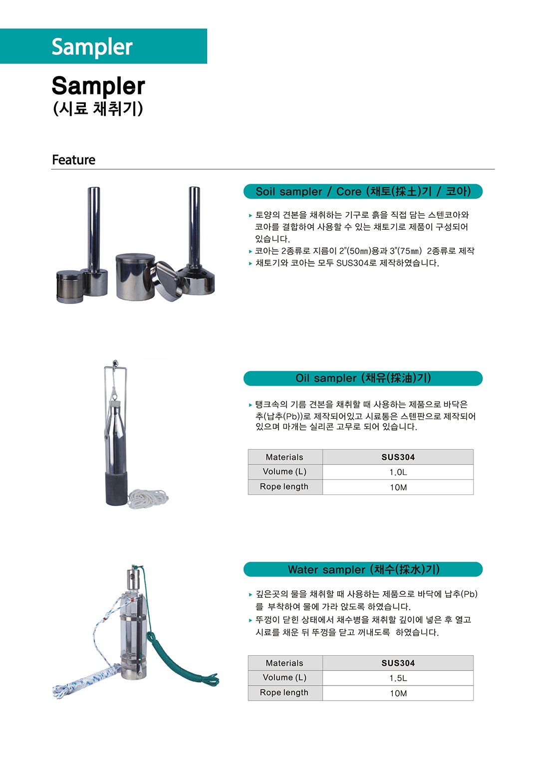 품명 채토기 (토양의 견본) , 채유기 (탱크 속의 기름 견본) , 채수기 (깊은 곳의 물)을 채취할 때 사용하는 제품입니다.