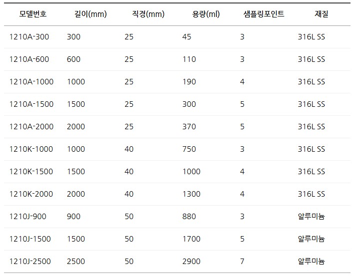 샘플의 오염을 최소화합니다. 샘플링 깊이와 용량에 따라 다양한 길이와 직경의 모델이 제공됩니다.
