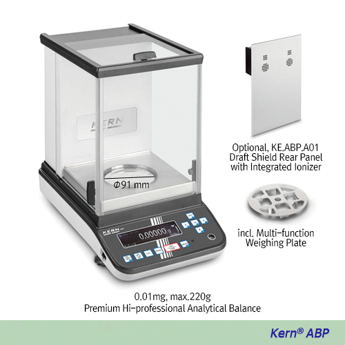 Kern® [d] 0.01mg, max.220g Premium Hi-professional Analytical Balance, with the Latest Single-Cell Generation for Extremely RapidWith Internal Calibration & Bright OLED Display, with Multi-function Weighting Plate, “ABP”, GLP/ISO Record Keeping