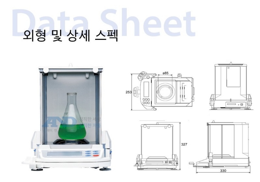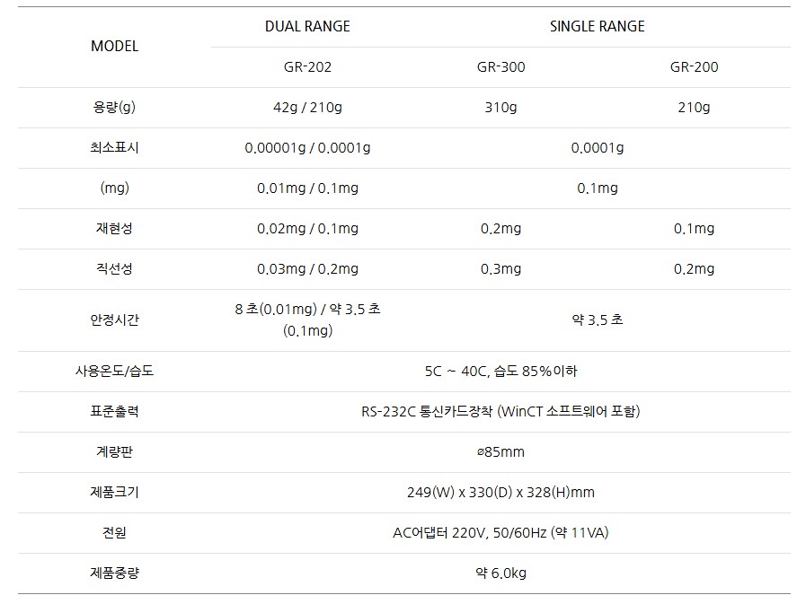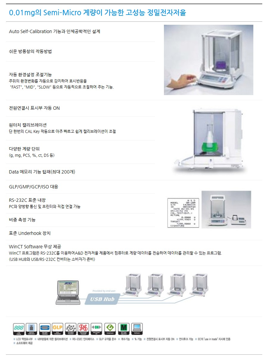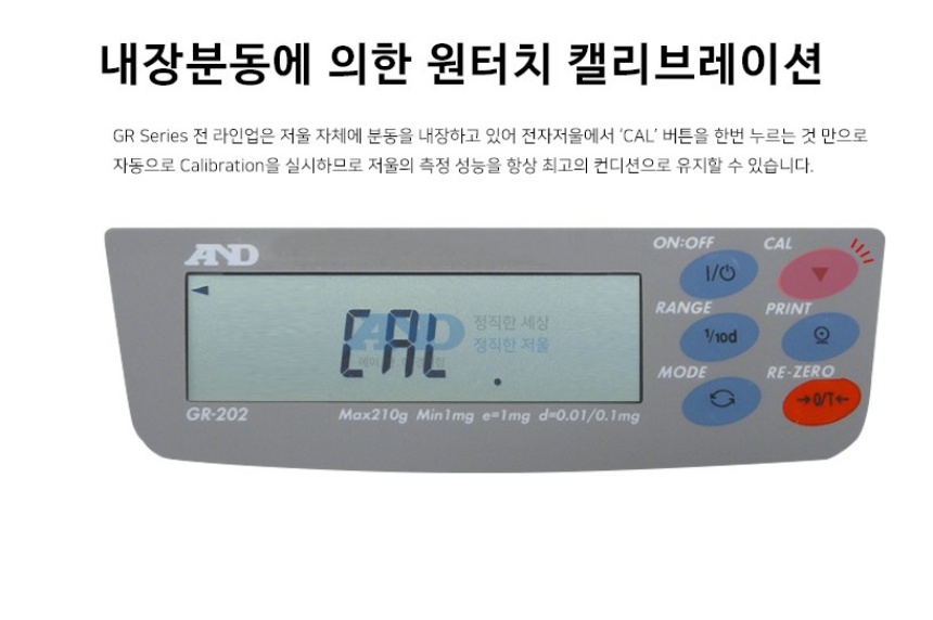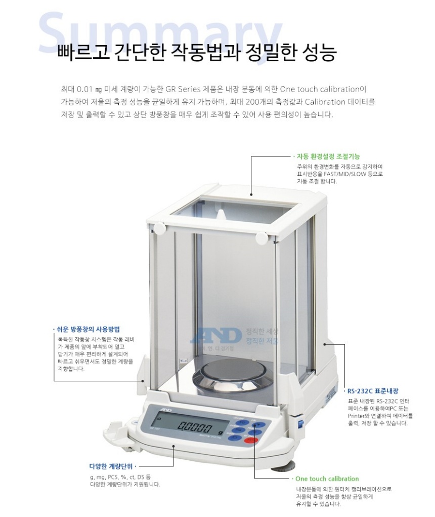 품명 0.01mg 정밀전자저울 GR 시리즈, 자동보정·RS232C·GLP대응 등 실험실과 품질관리용 고정밀 저울