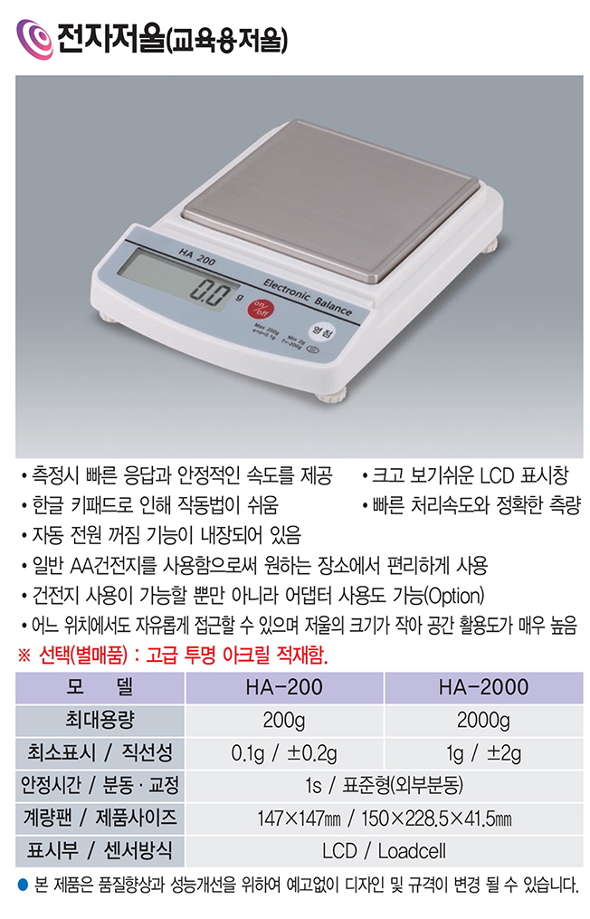 품명 빠른 응답속도와 안정적인 측정 성능을 갖춘 교육용 전자저울로, AA건전지 사용과 LCD 표시창으로 편리하며 200g·2000g 모델 선택이 가능한 실험·수업용 계량 장비입니다.