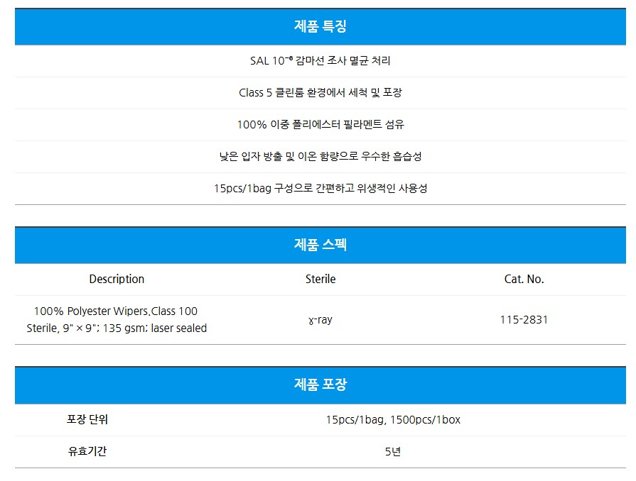 품명 VWR 폴리에스터 멸균 와이퍼(115-2831)는 감마선 멸균된 클린룸 전용 와이퍼로 낮은 입자 방출과 우수한 흡수성, 위생적인 포장으로 실험실에 적합합니다.