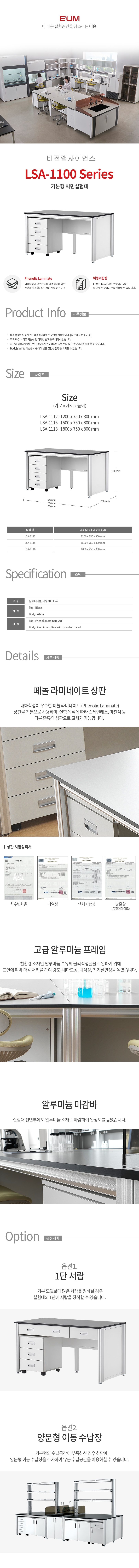 알루미늄 재질 벽면 실험대 기본형(4단 이동서랍 포함) 페놀라미네이트 상판 작업대 LSA-1112