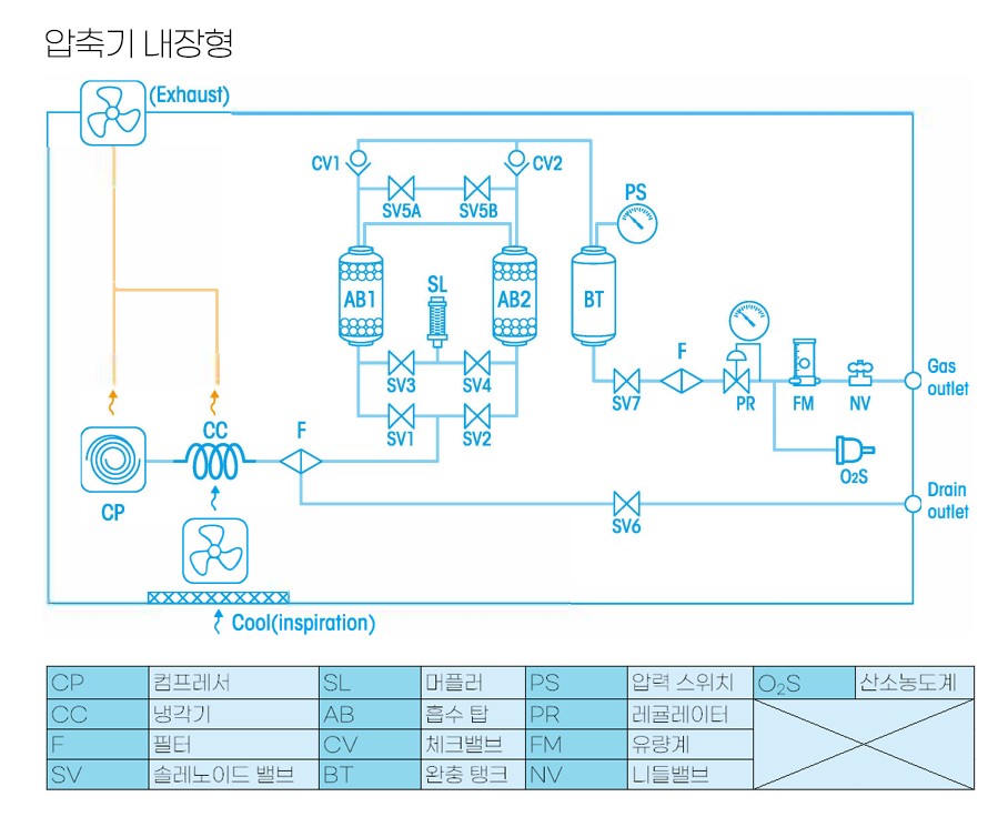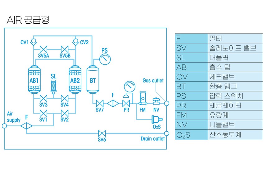 흡착 탱크 → 탈수 → 미세먼지 제거 필터 → 공급의 구조로 순차적으로 CDA를 정제하여 출력합니다.