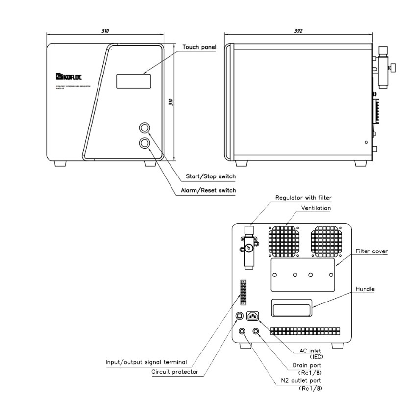 전면: 전원 스위치, 상태 표시 LED, 출구 포트후면: 전원 입력, 에어 입력, 제어 연동 포트탈착형 필터 장착 (탈수 및 이물질 제거용)