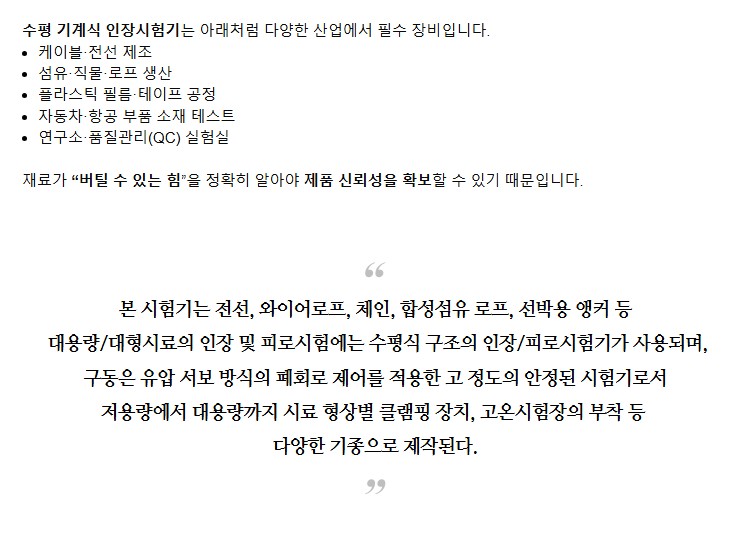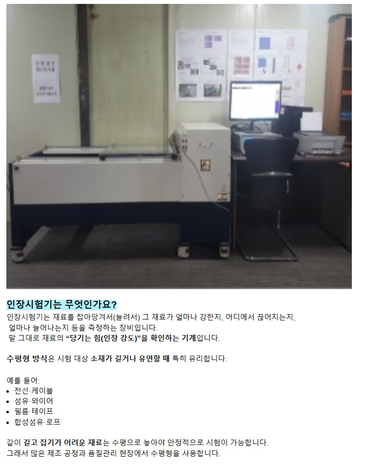 안정된 프레임 구조와 서보 모터 구동 방식을 적용하여 고하중에서도 정확한 인장 시험이 가능하도록 설계되었습니다.