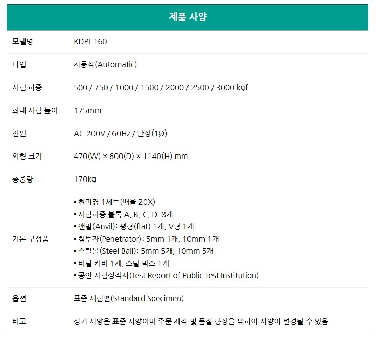 품명 KDPI-160 자동 브리넬경도시험기는 금속·주물·단조 소재의 경도를 정밀하게 측정하는 자동식 Hardness Tester로, 500~3000 kgf 하중과 다양한 지그 구성으로 산업 현장에서 폭넓게 활용됩니다.