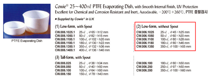 품명 PTFE 증발접시 Low-form, without Spout