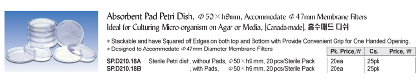 Absorbent Pad Petri Dish, Φ50×h9mm, Accommodate Φ47mm Membrane FiltersIdeal for Culturing Micro-organism on Agar or Media, [ Canada-made ] , 흡수패드 디쉬