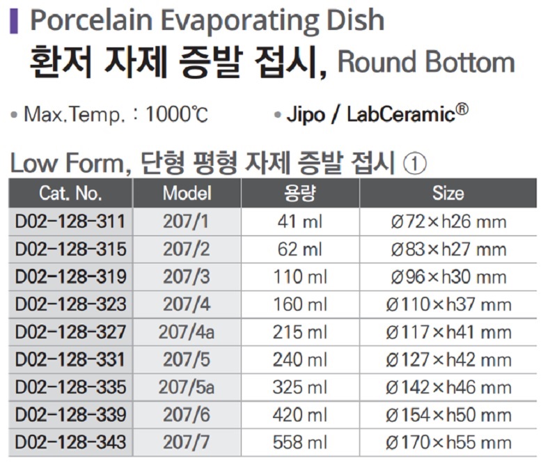 원형 자제 증발 접시 ②| Cat. No | Model | 용량 | Size |
