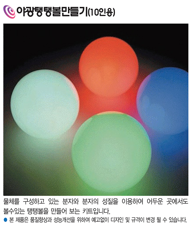 품명 야광탱탱볼 만들기 키트는 분자의 성질을 활용해 어두운 곳에서도 빛나는 탱탱볼을 제작하는 과학 체험 키트로, 학교 수업과 단체 활동에 적합한 10인용 구성의 교육용 실험 재료입니다.