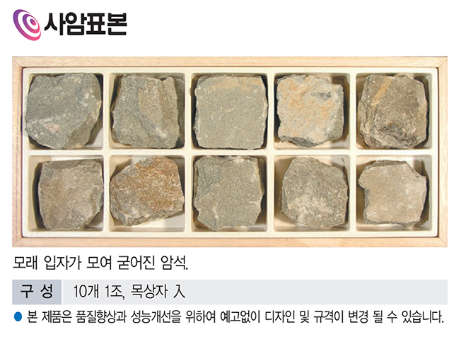품명 사암표본 세트는 모래 입자가 굳어 만들어진 퇴적암을 실물로 관찰할 수 있는 지질교육용 표본입니다. 10개 구성으로 수업, 관찰, 전시에 적합하며 자연 상태의 특징을 이해하는 데 도움이 됩니다.