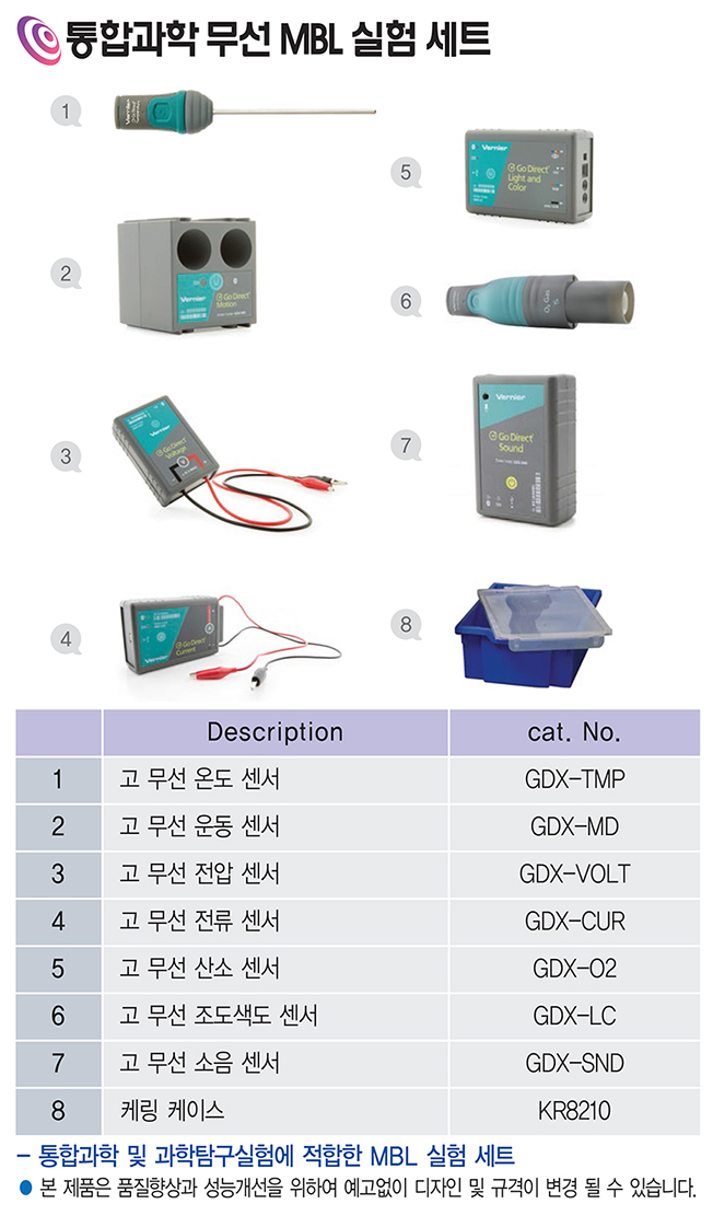 품명 코드번호 : VLS-0129 품명 : 통합과학 무선 MBL 실험 세트 개요 : 고 무선 온도 센서, 고 무선 운동 센서, 고 무선 전압 센서, 고 무선 전류 센서, 고 무선 산소 센서, 고 무선 조도색도 센서, 고 무선 소음 센서, 케링 케이스 구성