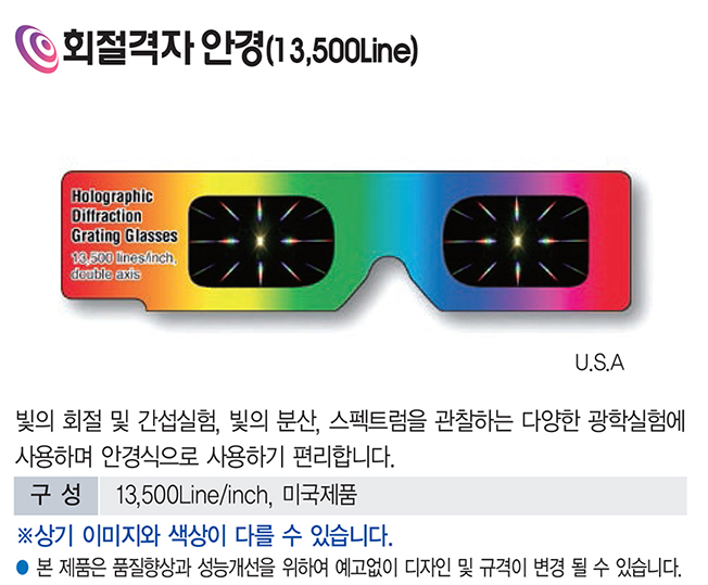 회절격자 안경(13,500Line)은 매우 높은 밀도의 회절 패턴을 가진 고정밀 광학 실험용 안경입니다.