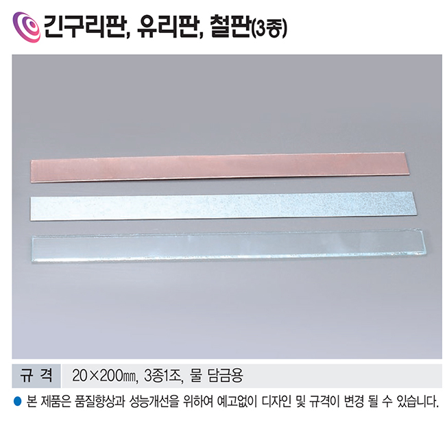 긴구리판, 유리판, 철판으로 구성된 3종 세트로, 물 담금 실험이나 전도성·열전도율 비교 실험에 활용되는 과학 교재입니다.
