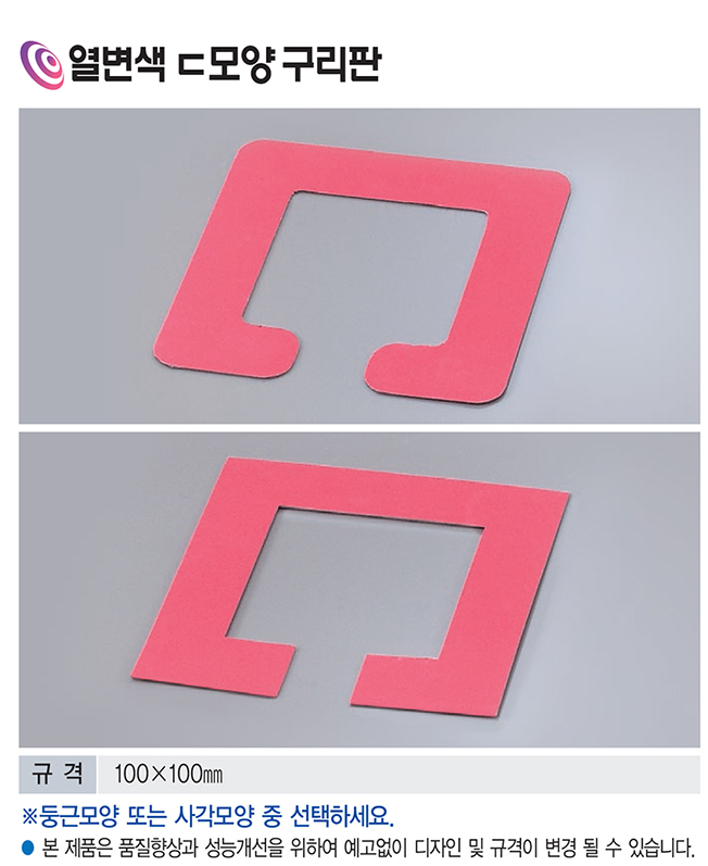 품명 온도 변화에 따라 색이 변하는 열변색 C모양 구리판! 100×100mm 규격으로 둥근형·사각형 선택 가능하며 과학실험 및 온도감응 학습에 적합합니다.