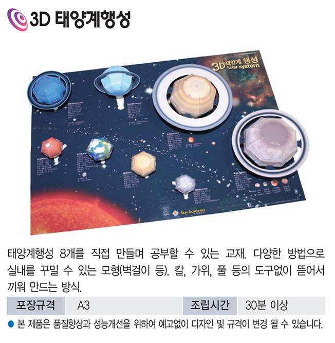 품명 직접 만드는 3D 태양계행성 세트! 8개 행성을 조립하며 과학 원리를 배우고 인테리어 소품으로도 활용 가능한 교육용 입체 모형 교구입니다.