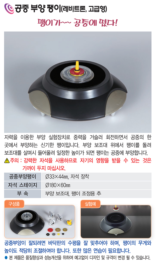 품명 자력을 이용한 부양 실험장치로 중력을 거슬러 회전하면서 공중의 한 곳에서 부양하는 신기한 팽이입니다. 부양 보조대 위에서 팽이를 돌려 보조대를 살며시 들어올려 일정한 높이가 되면 팽이는 공중에 부양합니다.