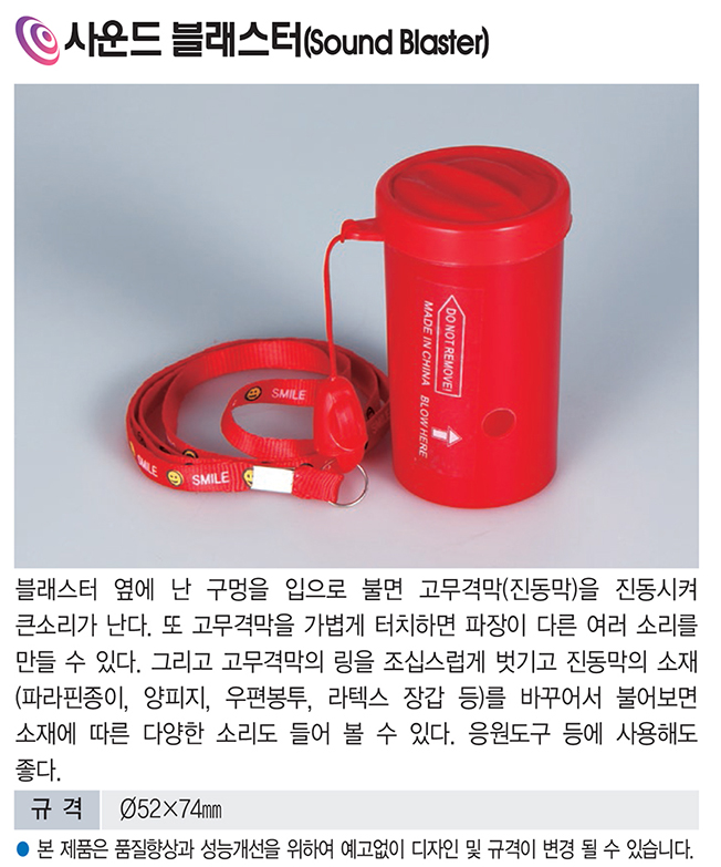개요 : 블래스터 옆에 난 구멍을 입으로 붋면 고무격막(진동막)을 진동시켜 큰소리가 난다. 또 고무격막을 가볍게 터치하면 파장이 다른 여러 소리를 만들 수 있다. 그리고 고무격막의 링을 조심스럽게 벗기고 진동막의 소재(파라핀종이, 양피지, 우편봉투, 라텍스 장갑 등)를 바꾸어서 불어보면 소재에 따른 다양한 소리도 들어볼 수 있다. 응원도구 등에 사용해도 좋다.