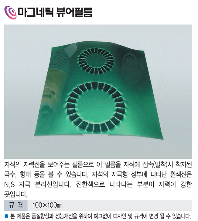 개요 : 자석의 자력선을 보여주는 필름으로 이 필름을 자석에 접촉(밀착)시 착자된 극수, 형태 등을 볼 수 있습니다. 자석의 자극형 성부에 나타난 흰색선은 N,S 자극 분리선입니다. 진한색으로 나타나는 부분이 자력이 강한 곳입니다.