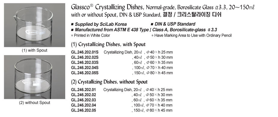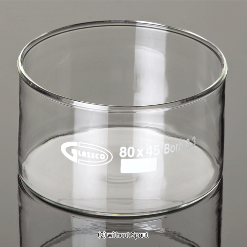 Glassco® Crystallizing Dishes, Normal-grade, Borosilicate Glass α3.3, 20~150㎖ with or without Spout, DIN & USP Standard