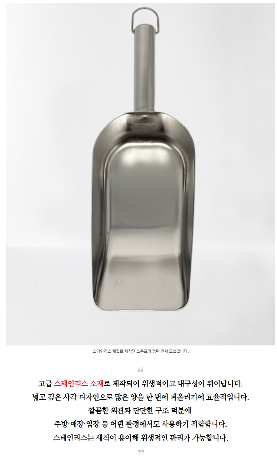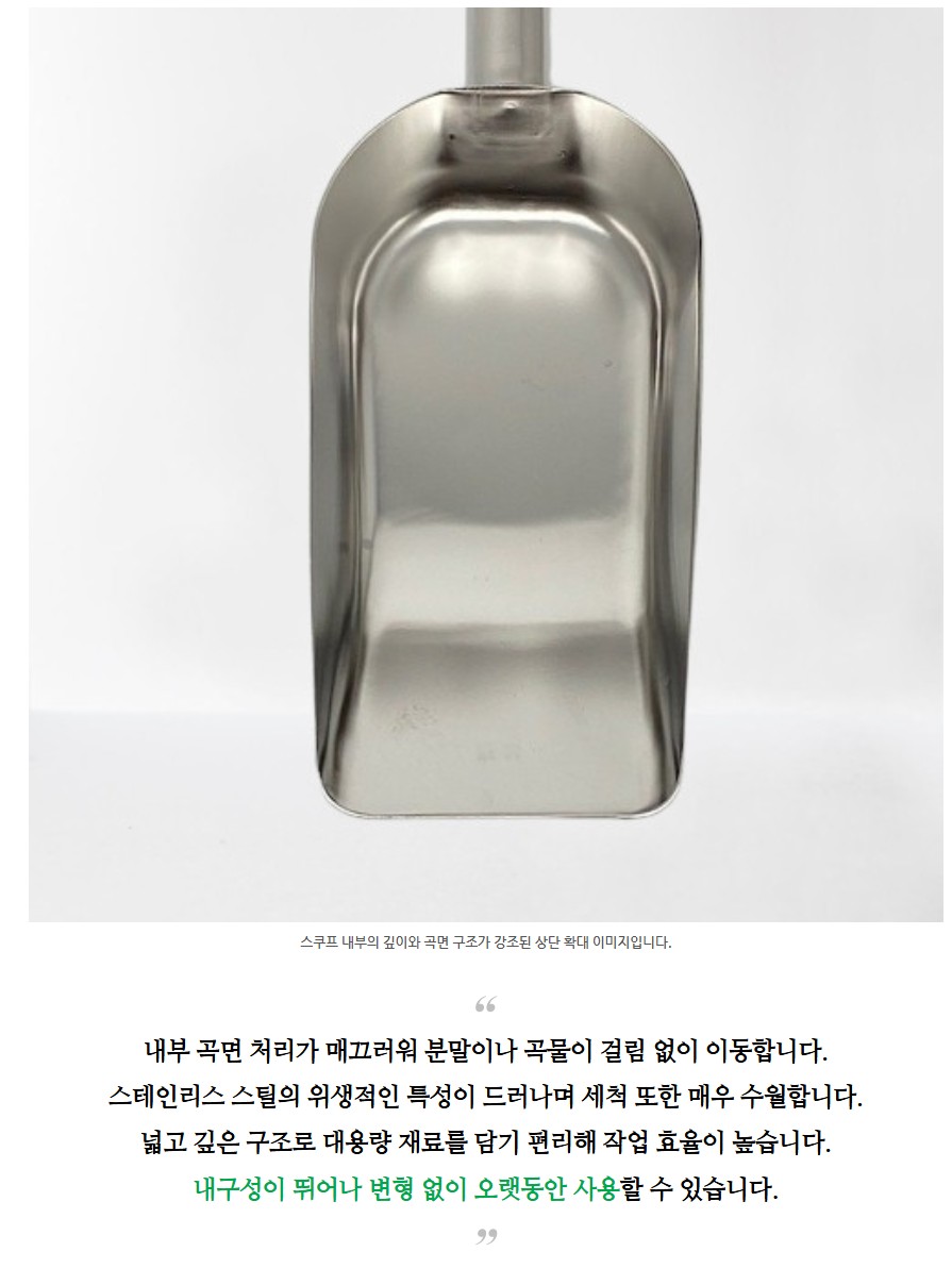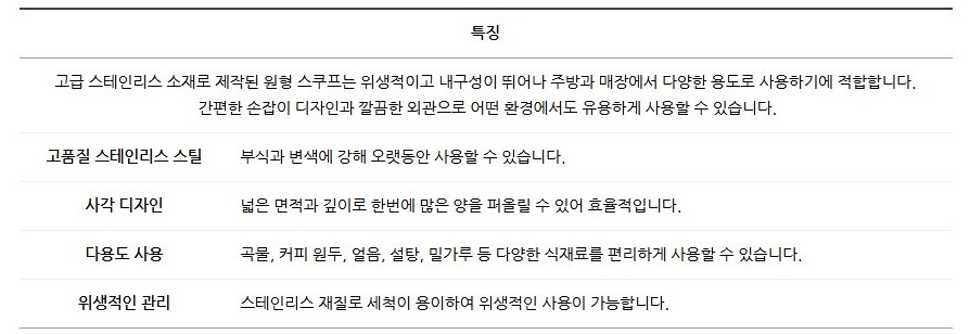 품명 고급 스테인리스로 제작된 사각 스쿠프로 위생적이고 내구성이 뛰어나며 곡물, 얼음, 커피 원두 등 다양한 재료를 효율적으로 덜어 사용할 수 있습니다.