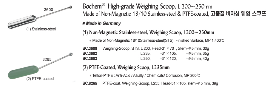 Bochem® High-grade Weighing Scoop, L 200~250mm Made of Non-Magnetic 18/10 Stainless-steel & PTFE-coated