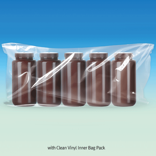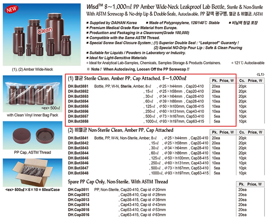 Wisd 8~1,000㎖ PP Amber Wide-Neck Leakproof Lab Bottle, Sterile & Non-Sterile With ASTM Screwcap & No-drip Lip & Double-Seals, Autoclavable, PP 갈색 광구병, 멸균 & 비멸균, ASTM